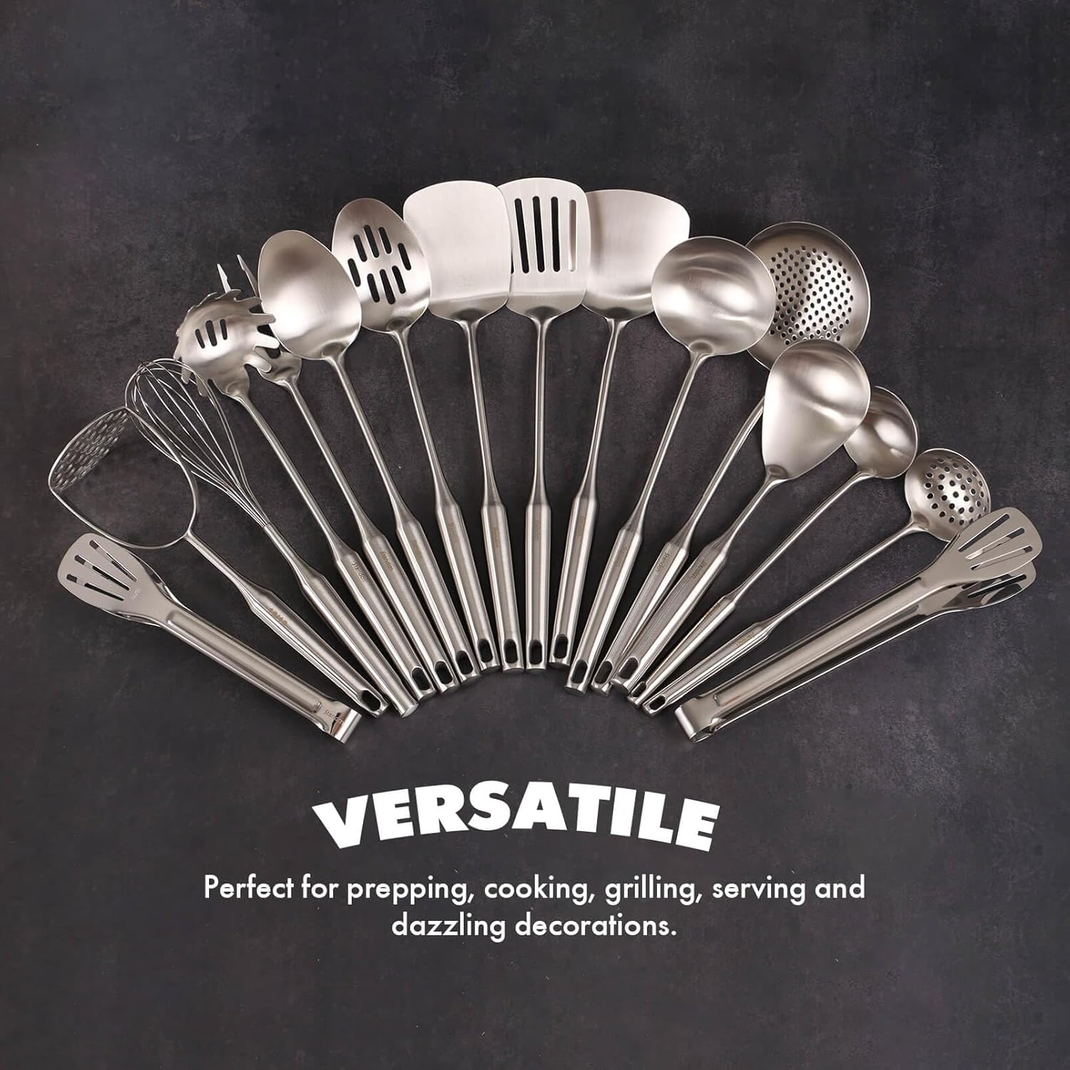 18/10 Stainless Steel Cooking Utensils Set – 16 PCS All Metal Kitchen Tools, Serving Utensils – Whisk, Masher, Fork, Tongs, Solid/Slotted Spoon, Spatula, Turner, Ladle, Skimmer, Pasta, Large Spoon Set