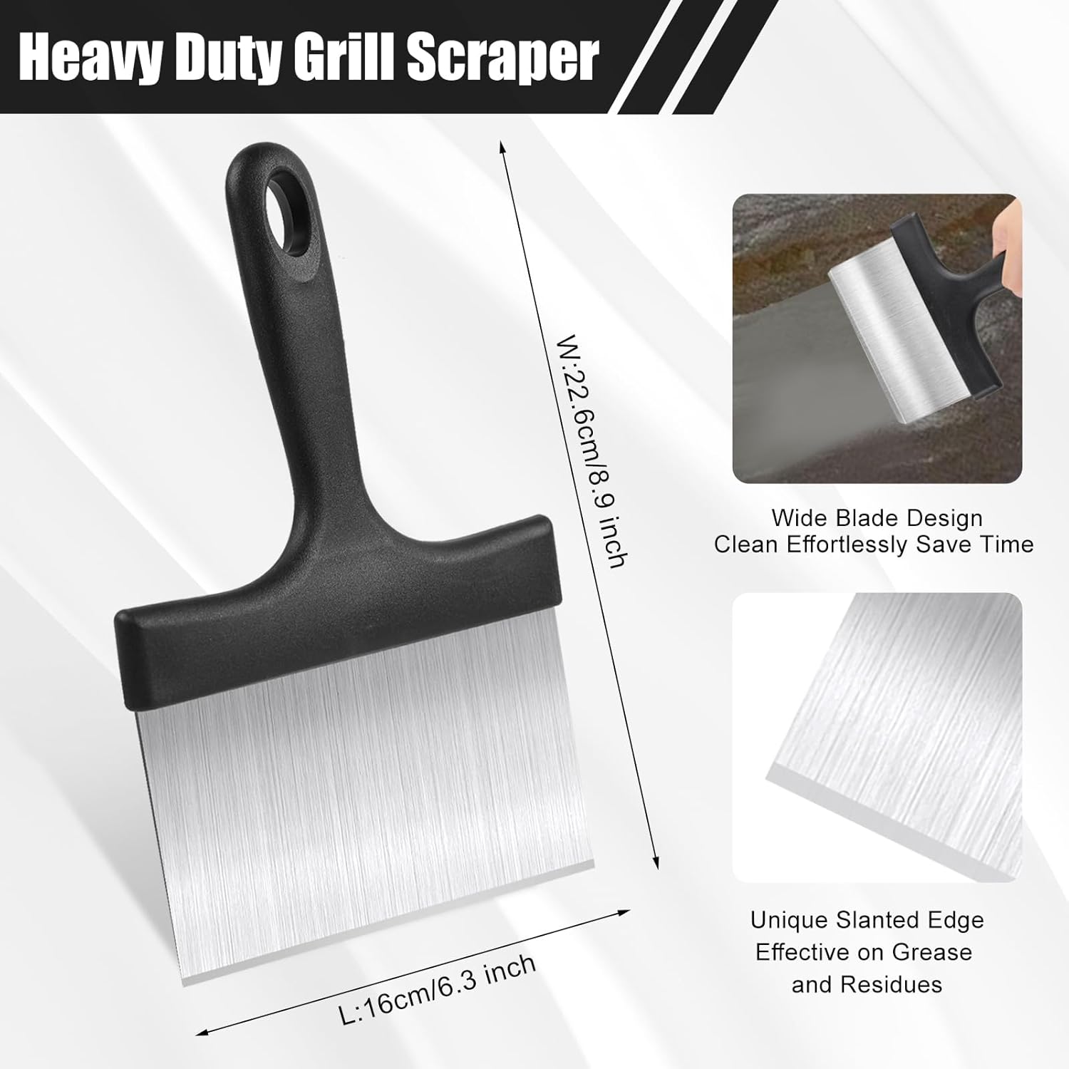 Premium Heat-Resistant Material: Crafted from high-strength stainless steel, this griddle scraper enhances durability while preventing rust and corrosion. The grill scraper’s thickened stainless steel construction is heat-resistant, ensuring the blackstone scraper won’t warp or get damaged during grilling, making the grill scraper for outdoor grill suitable for both hot and cold surface cleaning tasks.
