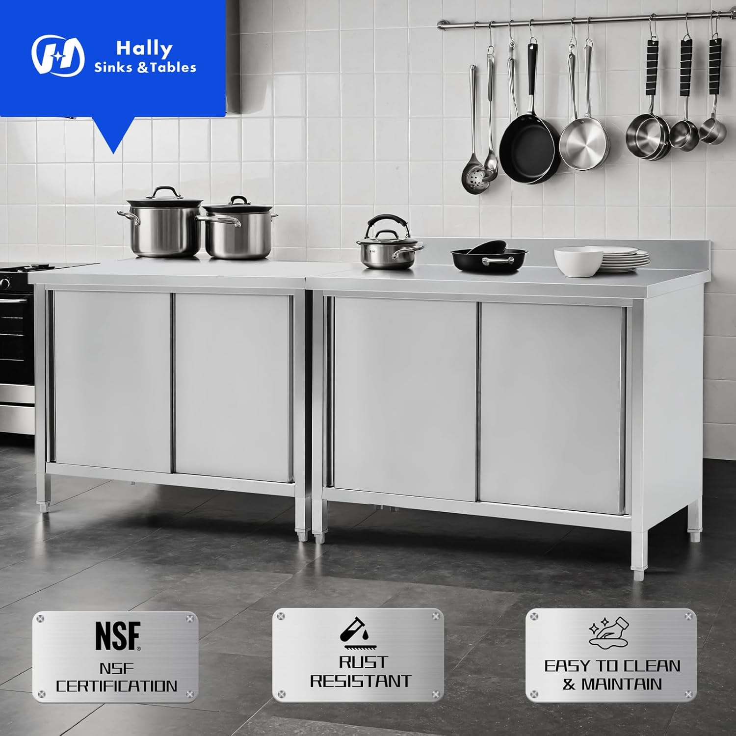 Hally Stainless Steel Cabinet, 30″ x 48″ NSF Commercial Heavy Duty Prep Workbench with Two Sliding Doors, Large Storage Cabinet, Metal Table for Kitchen, Restaurant, Garage