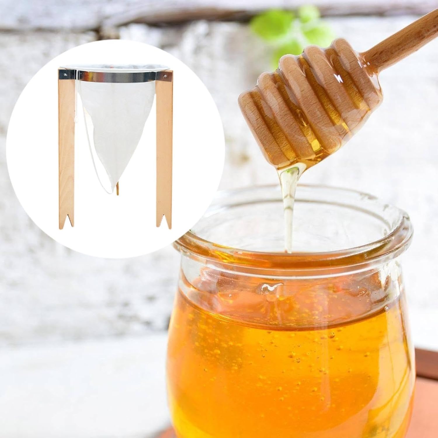 【User Friendly Design】: The honey filter stand bracket can be conveniently placed over a honey jar or bucket, allowing you to pour honey directly into it for seamless filtering