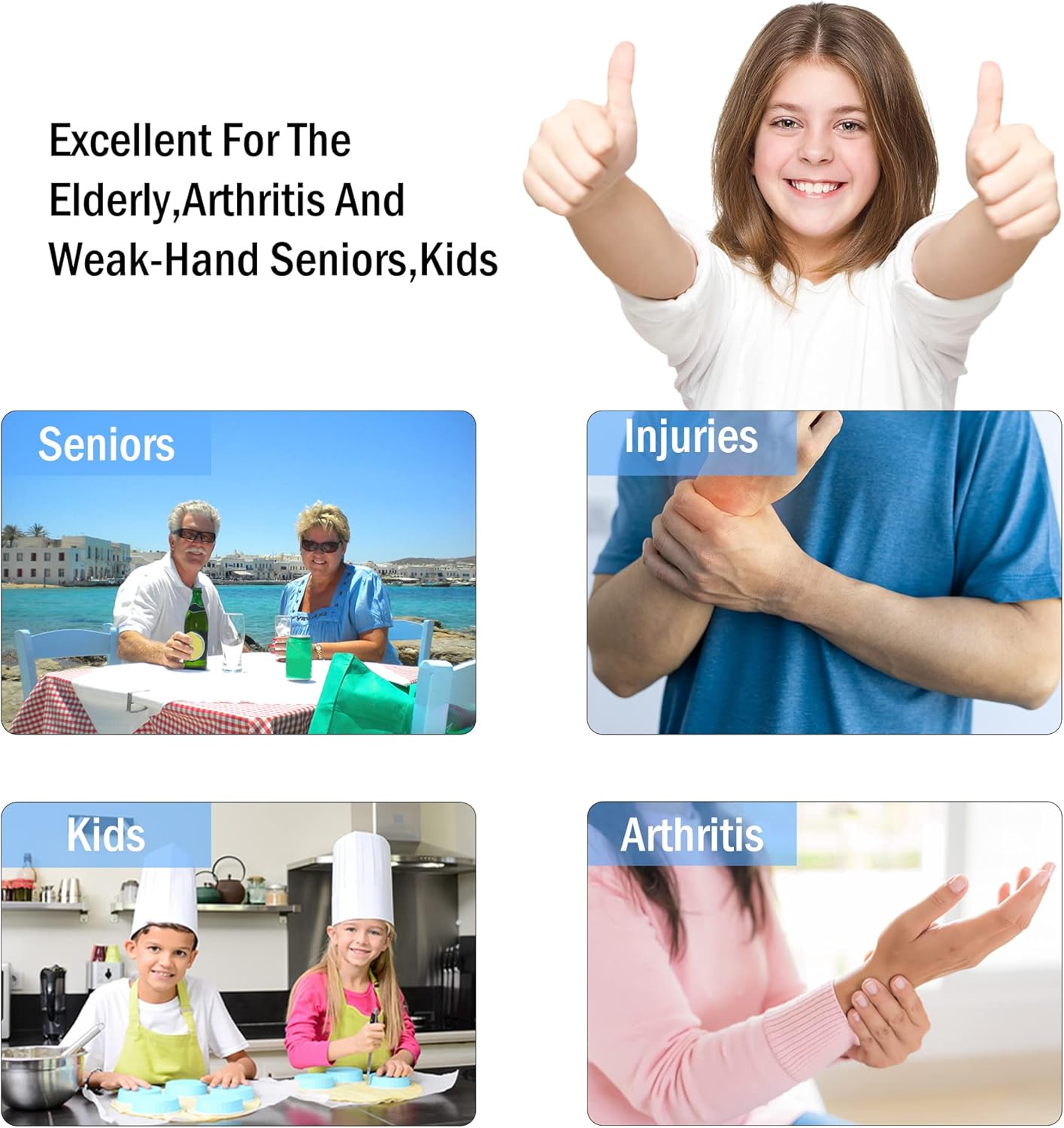 Specially designed for weak hands – It’s difficult for seniors and arthritis, rheumatoid sufferers, limited hand strength mobility or hand injuries sufferers to complete everyday tasks, especially while cooking. The HUMANFUN set will give your hands the power to open any jar, can or bottle. practical, convenient, save your time and strength, and putting NO extra stress on your fragile hand joint and ligaments!
