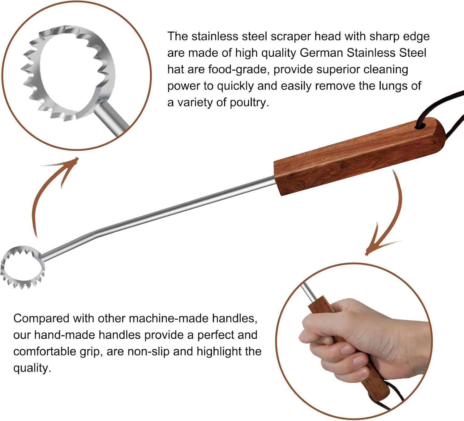 [MULTIPURPOSE KITCHEN TOOL] Our lung scraper are suitable for quickly and easily removing the lungs of a variety of poultry, including chickens, turkeys, ducks, geese, upland birds and more. Relieving the pressure from your hand even when prolonged use or heavy duty tasks. Improve your food prep efficiency by saving time to shift back and forth between different tools.