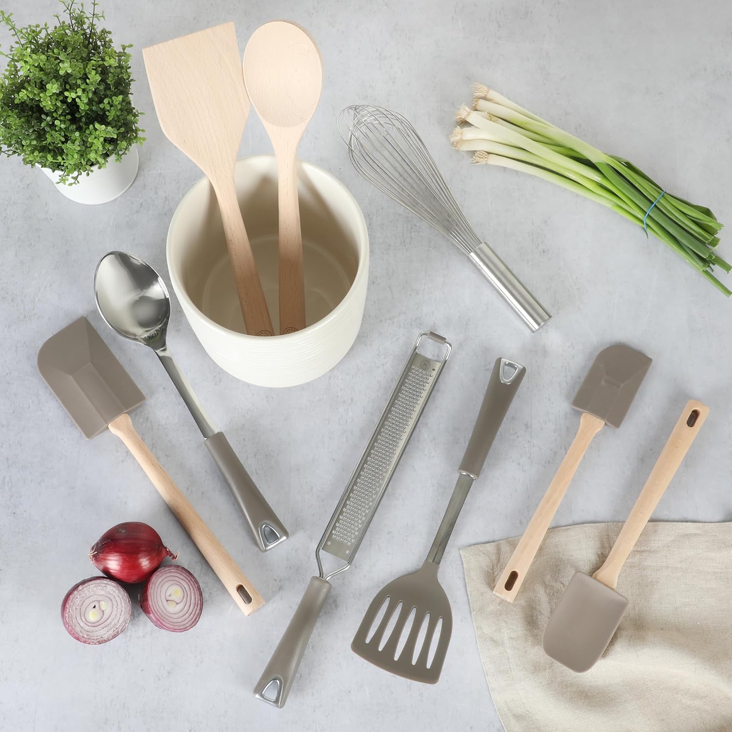 WHAT’S IN THE BOX: One stainless steel balloon whisk, one stainless steel long grater, one stainless steel serving spoon, one 14-inch beechwood spoon, one 14-inch beechwood turner, one silicone spatula, one oversized silicone spatula, one silicone spoonula, one slotted nylon turner, and one 7-inch ceramic utensil holder