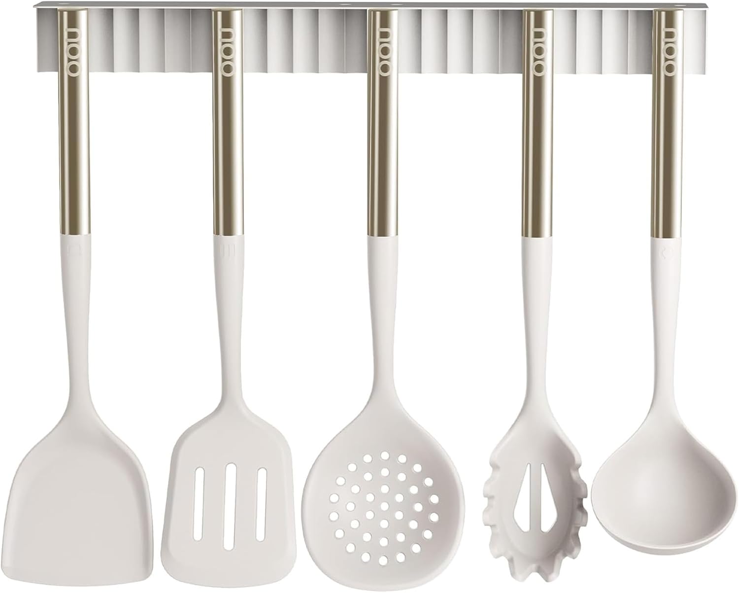 【Stylish & Gift-Ready】A must-have 5-piece utensil set with 1 magnetic stand. White silicone heads and gold stainless steel handles add elegance to any kitchen—an ideal gift for weddings, holidays, and housewarming parties.